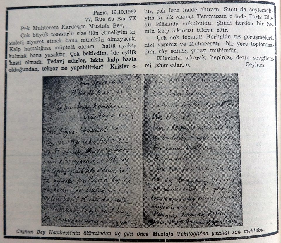مهاجیرت مطبوعاتینی آراشدیرارکن جیحون حاجیبیلینین اؤلوموندن اوچ گون اؤنجه یازدیغی سون مکتوبلا راستلاشدیق. جمهوریتین سونونجو داخلی ایشلر ناظری، مهاجیر مصطفی وکیل اوغلونا ۱۹ اوکتیابر ۱۹۶۲-جی ایلده گؤندردیی مکتوب «مجاهید» ژورنالینین ۵۳-۵۴-جو بیرلشمیش ساییندا یاییملانیب.