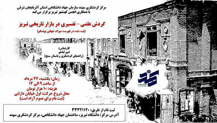 مركز گردشگری سهند سازمان جهاد دانشگاهی استان آذربایجان شرقی با همكاری انجمن كهن شهر تبریز برنامهای تخصصی با عنوان «گردش علمی – تفسیری در بازار تاریخی تبریز» را برگزار میكند.