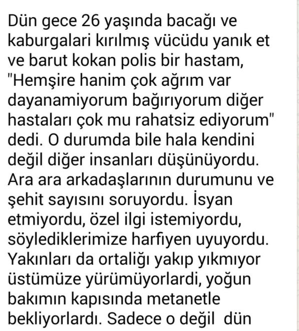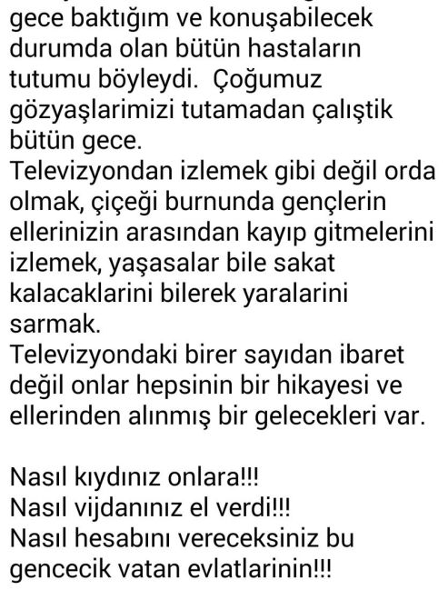 «دونهن ۲۶ یاشلی، آیاغی و قابیرغالاری قیریلان، بدهنی یانان ات و باریت قوخویان پلیس خستهم، «خانیم، چوخ آغریم وار، دایانا بیلمیرم، قیشقیریرام. دیگر خستهلری چوخ ناراحات ائدیرهم؟» دئییردی. او دورومدا بئله اؤزونو دئییل، دیگر اینسانلاری دوشونوردو. آرادا دیگر یولداشلارینی و شهید سایینی سوروشوردو. عصیان ائتمیردی، خصوصی قایغی ایستهمیردی، دئدیکلریمیزه عمل ائدیردی. یاخینلاری دا اورتالیغی آیاغا قالدیرمیر، اوستوموزه گلمیردیلر. رئانیماسییا اوتاغینین قارشیسیندا متانتله گؤزلییردیلر. یالنیز او یوخ، دونهن دانیشا بیلهجک وضعیتده اولان بوتون خستهلریم ائله ایدی. چوخوموز گؤز یاشیمیزی ساخلایا بیلمهدن بوتون گئجهنی ایشلدیک. تئلئویزوردا ایزلهمک کیمی دئییل اورادا اولماق. چیچه یی بورنوندا اولان گنجلرین اللرینیزین آراسیندان اوچوب گئتمهسینی ایزلهمک، یاشاسالار بئله علیل قالاجاقلارینی بیله-بیله یارالارینی ساریماق...