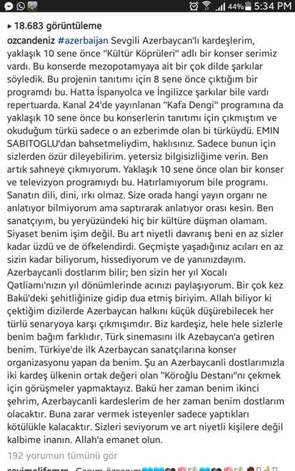 من صنعتچییهم. یئر اوزوندهکی هئچ بیر مدنیته دوشمن اولا بیلمرهم. سیاست منیم ایشیم دئییل. بو پیس نیتلی داورانیش منی آزی سیزین قدر مایوس ائتدی، همچینین عصبیله شدیردی. کئچمیشده یاشادیغینیز آغری-آجیلاری آزی سیزین قدر بیلیرم، حیسس ائدیرهم و یانینیزدایام. آذربایجانلی دوستلاریم بیلیر: من هر ایل خوجالی قتلی عامینین ایل دؤنومونده آجینیزی پایلاشیرام. بیر نئچه دفعه شهیدلر خیابانینا گئدیب دعا ائتمیشهم. الله دا بیلیر کی، چکدییمیز سئریاللاردا آذربایجان خالقینین آشاغیلایا بیلهجک ایستهنیلهن سسئنارییه قارشی چیخمیشام. بیز قارداشیق. تورک فیلمینی آذربایجانا گتیرهن منهم. تورکییهده آذربایجان صنعتچی لرینین کونسئرتینین تشکیلاتچیلیغینی دا ایلک دفعه من ائتمیشهم. حاضیردا آذربایجانلی دوستلاریمیزلا ایکی قارداش اؤلکهنین اورتاق عابدهسی اولان «کوراوغلو» داستانینی چکمک اوچون موذاکیرهلر آپاریریق. باکی هر زامان منیم ایکینجی شهریمدیر، آذربایجانلی قارداشلاریم دا هر زامان منیم دوستلاریم اولاجاقلار. بونا ضرر وئرمک ایستهیهنلرین پیسلیگی اؤزلرینه قالاجاق. سیزلری سئویرم و پیس نیتلی آداملارا دئییل، قلبیمه اینانین. اللها امانت اولون».