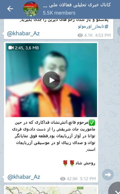 گونئی آذربایجانین "تلگرام" کاناللارینین بیرینده آذربایجانلی گنجین وظیفه بورجونو یئرینه یئتیررکهن اؤلدویو حاقدا خبر یاییلیب.