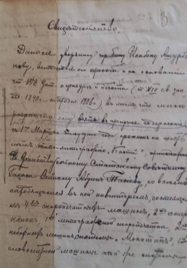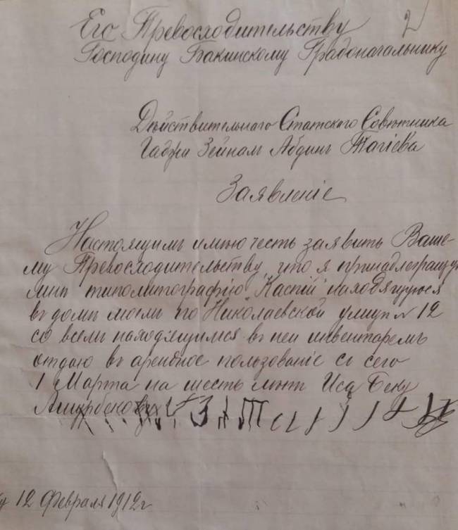 بیلدیریر کی، باکیدا اونا مخصوص، نیکولایئوسکی کوچهده یئرلشن "کاسپی» مطبعهسینی بوتون اینونتارلاری ایله بیرگه ۱۹۱۲-جی ایل مارتین ۱-دن ۶ ایل مدتینه ایجاریه وئریر. ه. ز. تاغییئوین همین عریضهسینه اساساً ای.آشوربیلییه "کاسپی» مطبعهسینین شهادتنامهسی وئریلیر.
