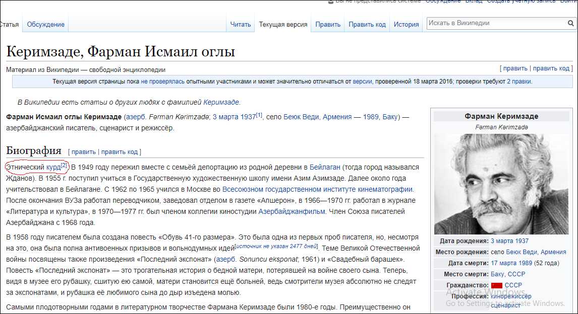گؤرکملی یازیچی فرمان کریمزادنین ویکیپدییاداکی بیوگرافییاسینین روس دیلی ورسییاسیندا میللیتی کورد کیمی قئید اولونوب.