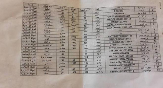 عراق اوردوسونون نینووا بؤلگهسینده ایشید-ا عایید بیر سیغیناجاقدا تاپدیغی سندده ترورچولارین ایستیفاده ائتدیی آوتوموبیل مارکالاری ایله باغلی معلوماتلار یئر آلیب.