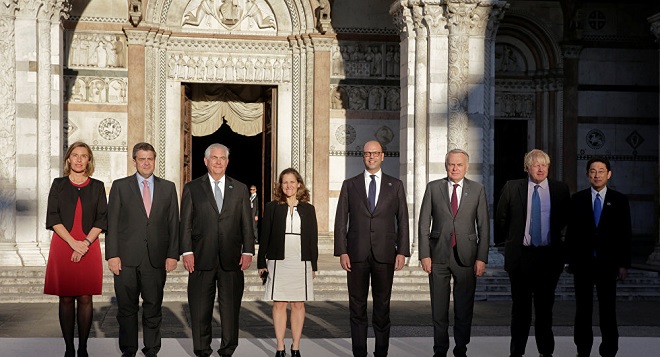 آخار. آذ خبر وئریر کی، بو سؤزلر بؤیوک یئددیلیک اؤلکهلرینین خاریجی ایشلر ناظیرلرینین یایدیغی اورتاق بیاناتدا یئر آلیب. گ۷ اؤلکهلری همچینین سورییانین اراضی بوتؤولویونون تطرفداری اولدوقلارینی بیان ائدیبلر.