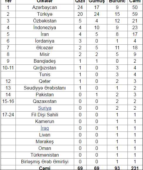 بونونلا دا عمومی مئداللاریمیزین سایی ۵۰-یه چاتیب. بونون ۲۴-او قیزیل، ۱۷-سی گوموش، ۹-او بورونجدو. ییغمامیز بو گؤستریجی ایله ایسلام همریلیگی اویونلارینین مئدال سیرالاماسیندا ۱-جی پیللهده قرارلاشیب.