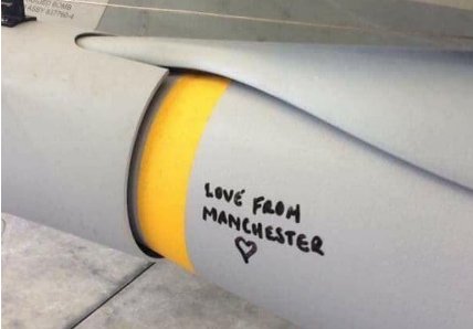 آخار. آذ خبر وئریر کی، «تلگقراف» قزئتینین تویتر صحیفهسینده پایلاشیلان فوتودا بومبانین اوزرینه «مانچستردن سئوگیلرله» یازیلدیغی گؤرونور.