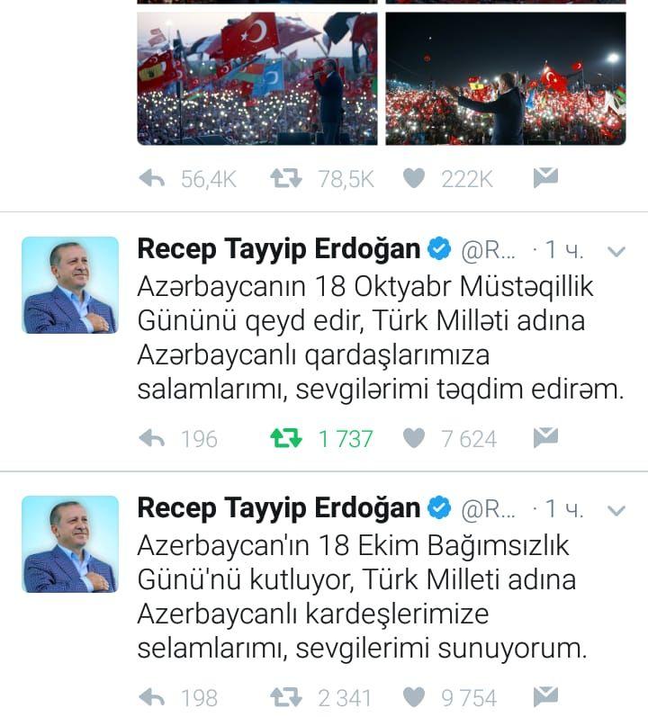 تورکییه پرزیدنتی رجب طایییب اردوغان ۱۸ اوکتیابر - آذربایجانین موستقیللیک گونو ایله باغلی آذربایجان خالقینی تبریک ائدیب.