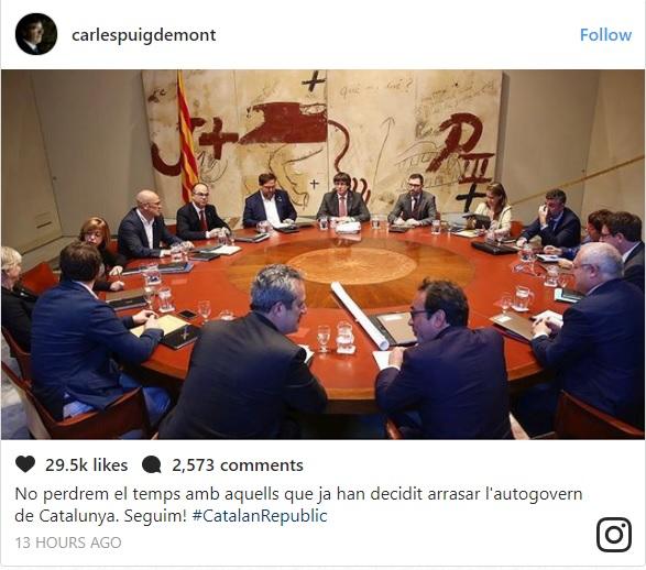 پوچدمون ایجلاسدان سونرا اؤز اینستاگرام صحیفهسینده ایجلاسین فوتوسونو پایلاشاراق، کاتالونییا موستقیللییندن ال چکمهیهجکلرینی بیلدیریب: