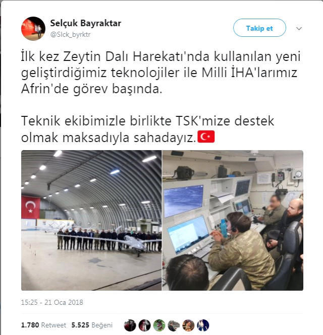 "یئنی ایستحصال ائتدییمیز ان سون تکنولوگییالارا جاواب وئرن آوادانلیقلاریمیز ایلک دفعه "زیتون بوداغی" عملیاتیندا ایستیفاده اولونور. تکنیکی ایشچیلریمیزله تورکییهنین حربی هاوا قوهلرینه دستک اولماق اوچون بورداییق".