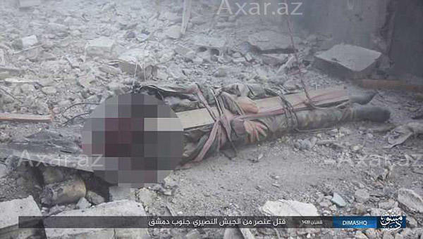 ترورچولار اسیرلردن بیرینه حربی گئییم گئییندیرهرک ال قولونو باغلاییب. تاختا اوزرینه باغلانان اسیر طییارهلرین بومباردمان ائتدیی کوچهده علاجسیز وضعیتده جان وئریب.