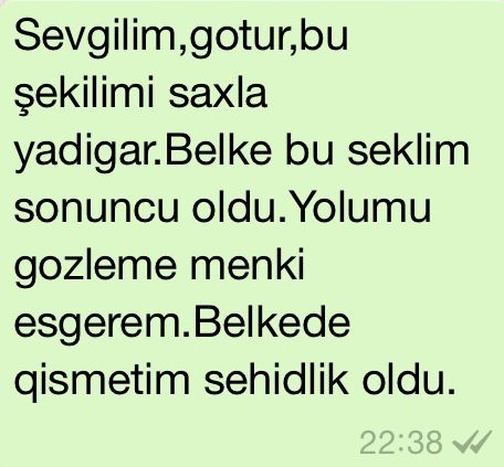 جبههنین آغدام رایونو ایستیقامتینده دوشمن تخریباتینین قارشیسینی آلارکن قهرمانجاسینا شهید اولموش، قازاخ رایون داش سالاحلی کند ساکینی، ۱۹۹۷-جی ایل توللودلو سلیمانوو سلیمان ائلچین اوغلونون حربی گئییمینین جیبیندن سئوگیلیسینه یازدیغی شعیر تاپیلیب.