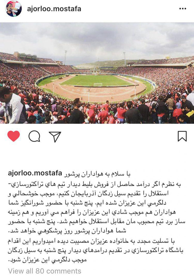 آخار. آذ خبر وئریر کی، اؤز اینستاگرام صحیفه‌سینده کلوبون ایجراچی دیرکتورو مصطفی آجرلو اینفورماسییا یایاراق، جمعه آخشامی تبریزده اوینانیلاجاق «تراکتورسازی» – «ایستیقلال» اویونوندان الده اولونان گلیرلرین سیل و داشقیندان خسارت آلان شخصلره وئریلجیینی بیلدیریب. آجرلو بونونلا علاقدار اولاراق بوتون «تراکتورسازی» طرفدارلارینی ایستادیونا سسله‌ییب.