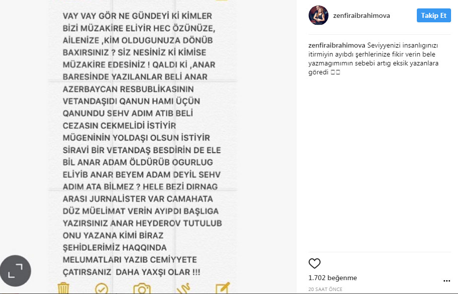 "گؤر نه گوندییک کی، کیملر بیزی مذاکیره ائلییر. عائلهنیزه، کیم اولدوغونوزا دؤنوب باخیرسینیز؟ آنار آذربایجان رسپوبلیکاسینین وطنداشیدیر. قانون هامی اوچون قانوندور. ایستییر موغننینین یولداشی اولسون، ایستییر سیراوی وطنداش، سهو آددیم آتیب، جزاسینی چکمهلیدیر. بسدیرین، ائله بیل آنار آدام اؤلدوروب، اوغورلوق ائدیب. آنار آدام دئییل، سهو آددیم آتا بیلمز؟ سوییهنیزی، اینسانلیغینیزی ایتیرمیین، شرحلرینیزه فیکیر وئرین".